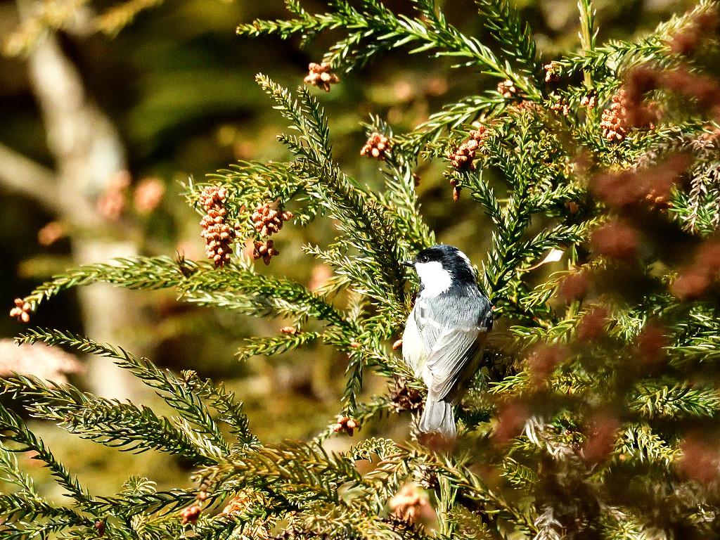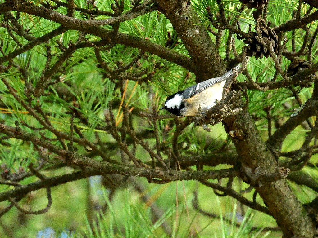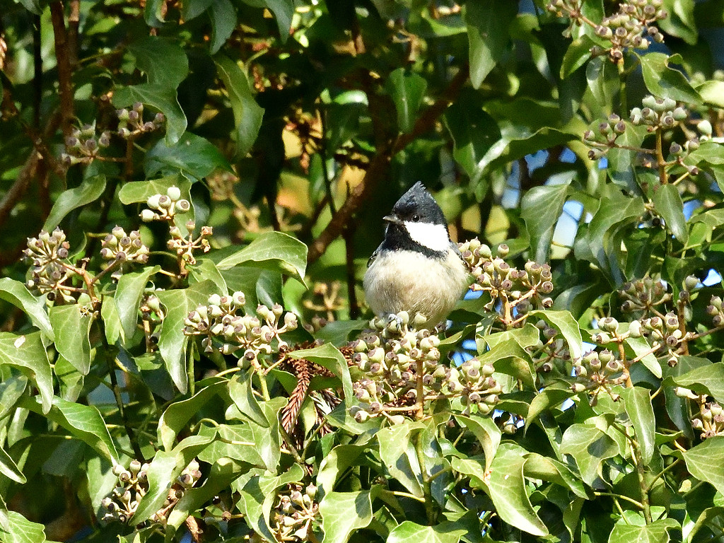 針葉樹林に棲息 冠羽が目立ち、後頭部は白い無目の黒斑は大きく白い頬を取り巻いて、頭の黒とつながる 2本の白い翼帯がある。
