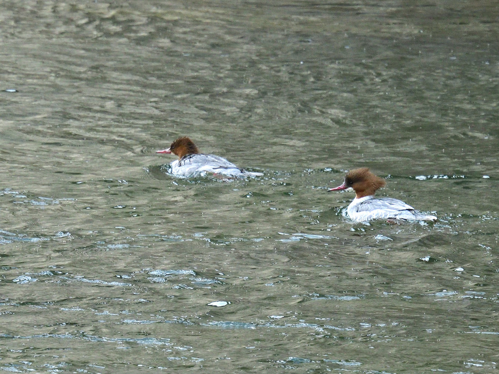 オスは赤い嘴、緑の頭、白い胸のコントラストが鮮やか。メスは茶色い頭に白い胸、羽は灰色でオスに比べ地味なアイサで。大型であるが故、飛ぶと時は水面を何歩か助走しながら飛び立つ (似た鳥)