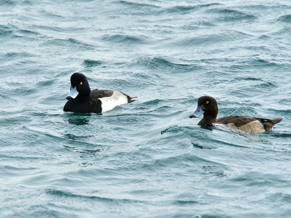 長い冠羽を垂らし、金色の目をした黒と白の渡り鳥 日本には冬鳥として渡来する