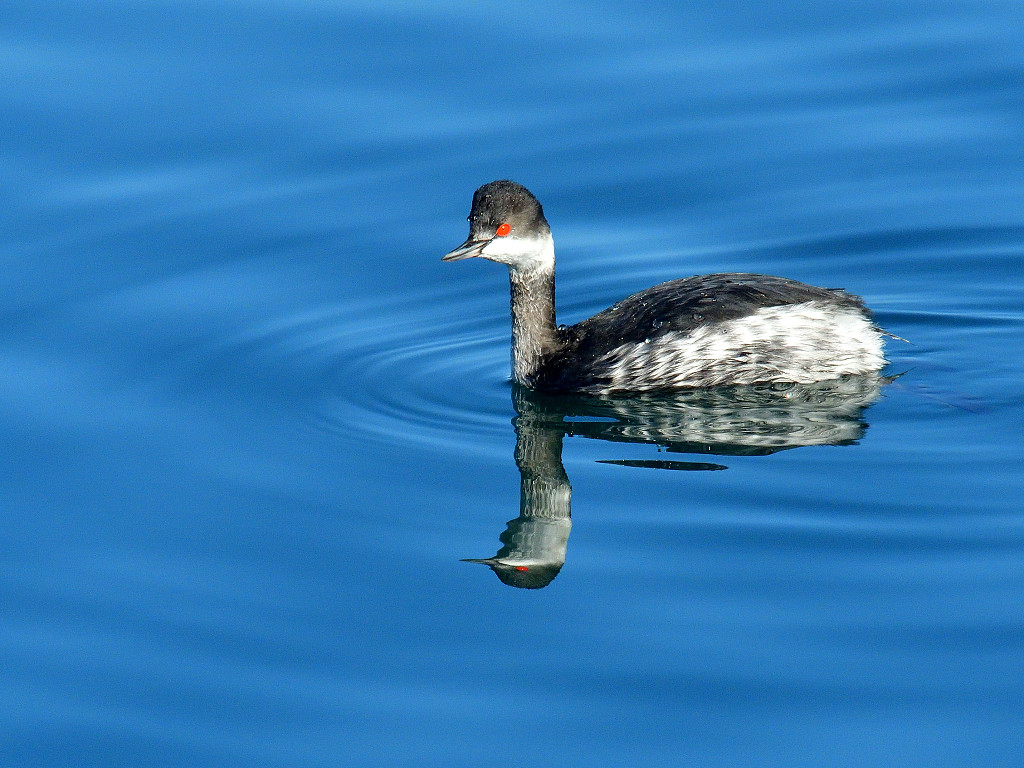 くちばしが上に反りかえり、首の全面が汚れた灰色をしている。目は赤い。