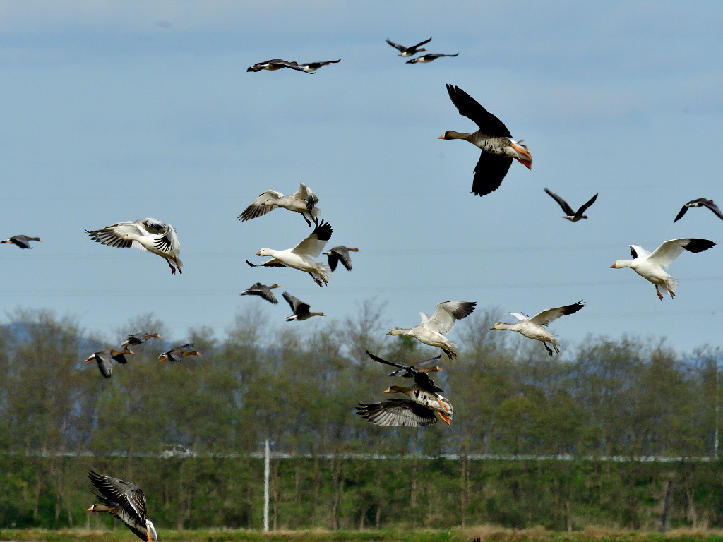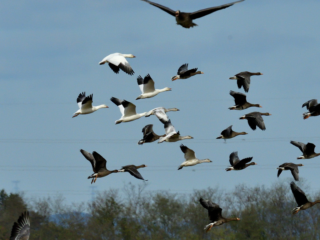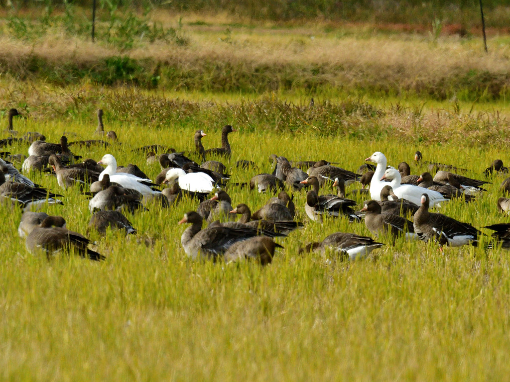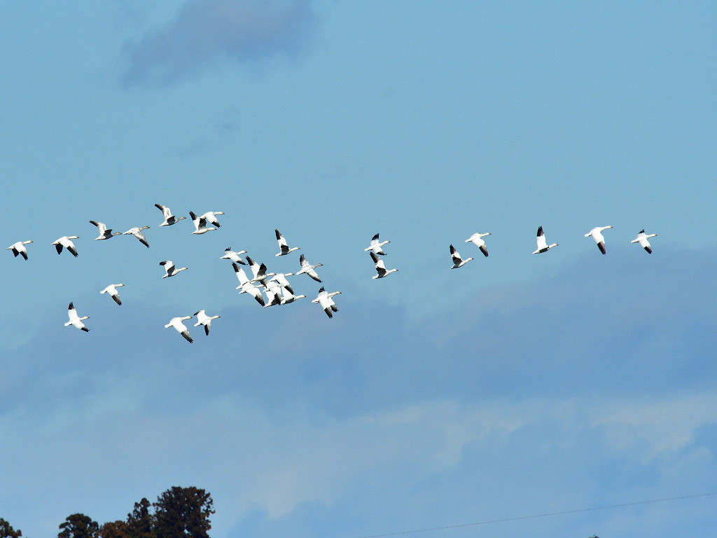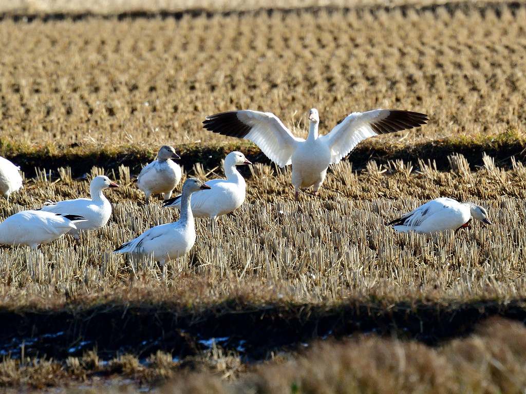 翼の先だけが黒く、全身白いガン くちばしと脚はピンク色 飛ぶと黒い初列風切が目立つ