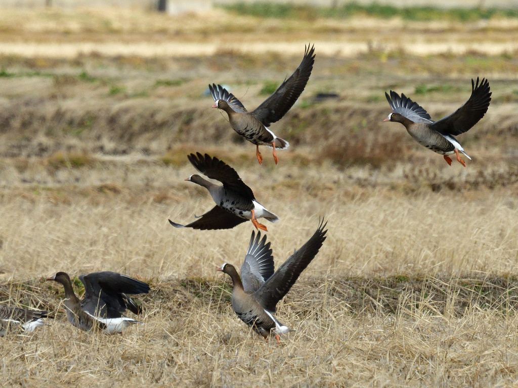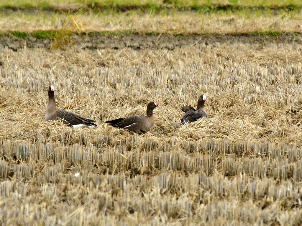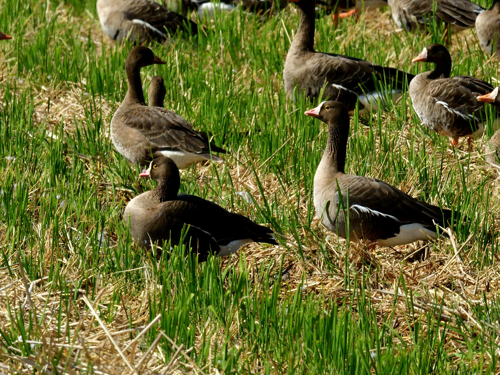 マガに似ているが、ピンクのくちばしと黄色のアイリング 額の白色部は頭頂部までのびている また、翼をたたんだとき、翼の先が尾羽より突出することも特徴的