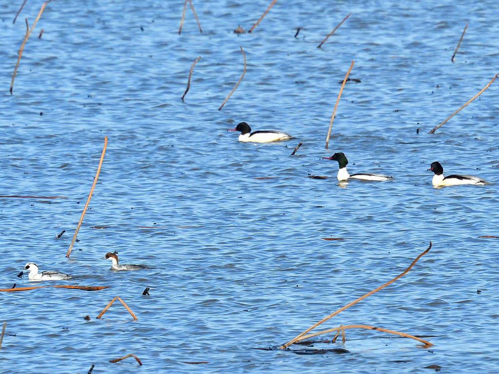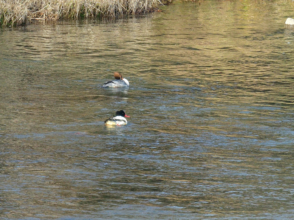 オスは赤い嘴、緑の頭、白い胸のコントラストが鮮やか。メスは茶色い頭に白い胸、羽は灰色でオスに比べ地味なアイサで。大型であるが故、飛ぶと時は水面を何歩か助走しながら飛び立つ (似た鳥)