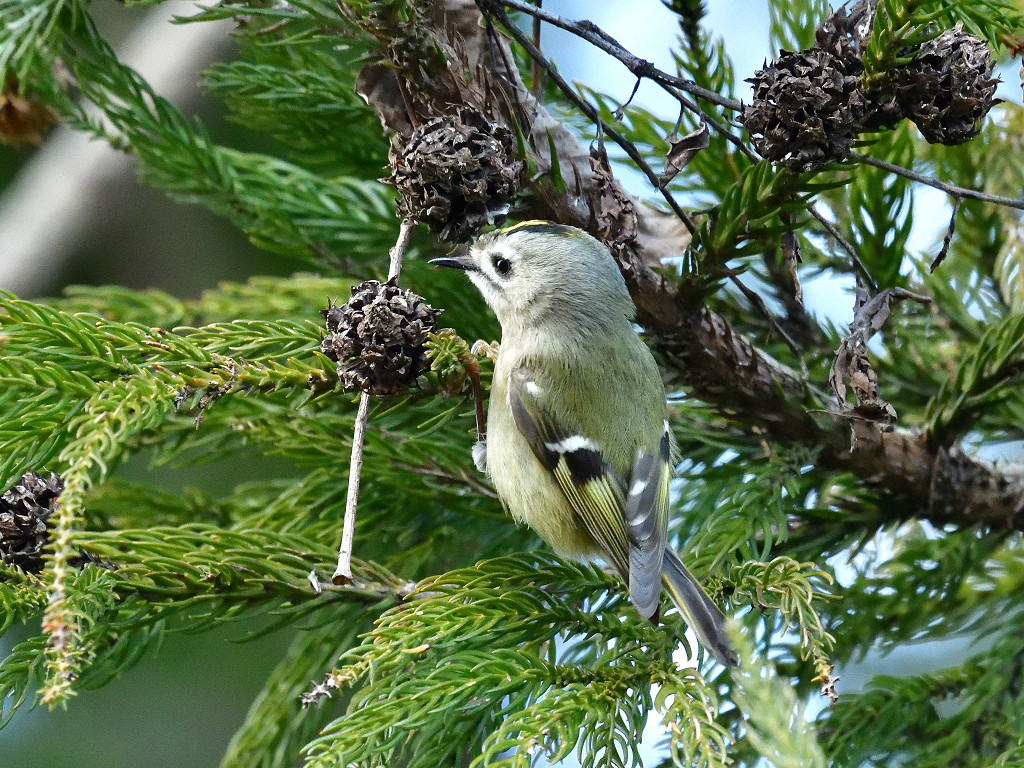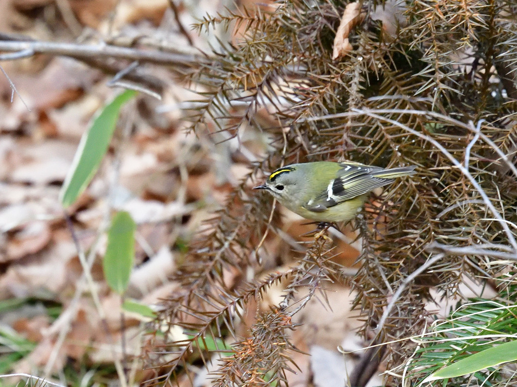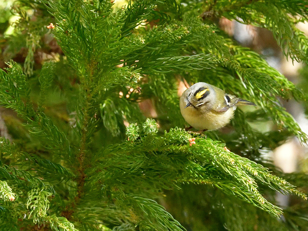 頭に黄色い冠を持った、針葉樹の好きな日本最小の鳥 翼の白い翼帯と羽縁、白い目の周りなど、頭の黄色い冠を菊に見立てて「キクイタダキ」 菊の中にはっきりとオレンジ色が判るのが♂です