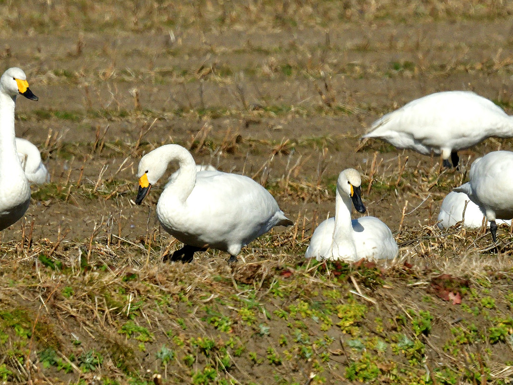 に良く似ているが、全体にやや小ぶり、嘴の黄色い部分が小さい(鼻の穴の手前まで)また頸の長さはオオハクチョウに比べ短い