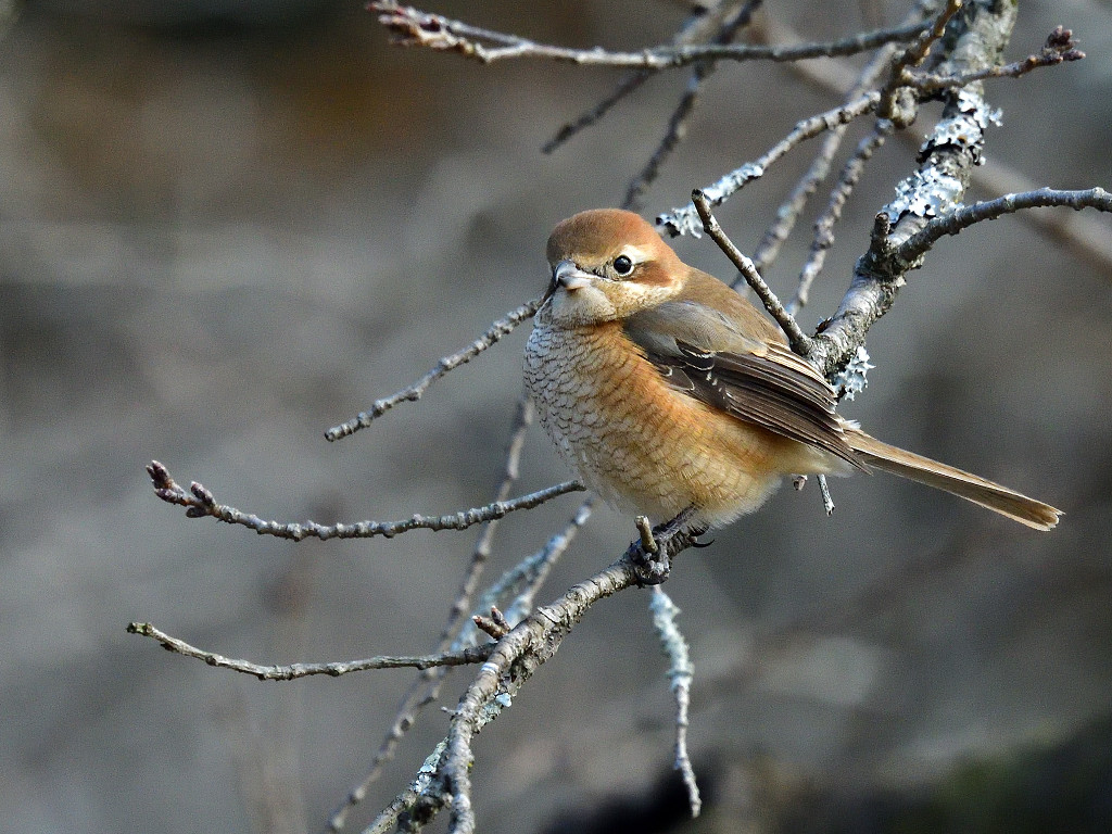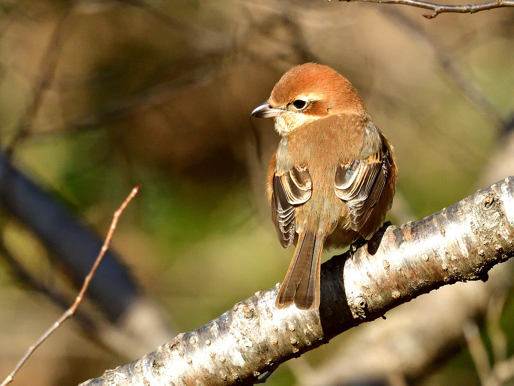 鋭い嘴をもち、「はやにえ」を作る小形の猛禽 北海道から九州に分布 オスは黒い過眼線、翼の白斑 メスでは茶色い過眼線、 波模様のある下面が特徴