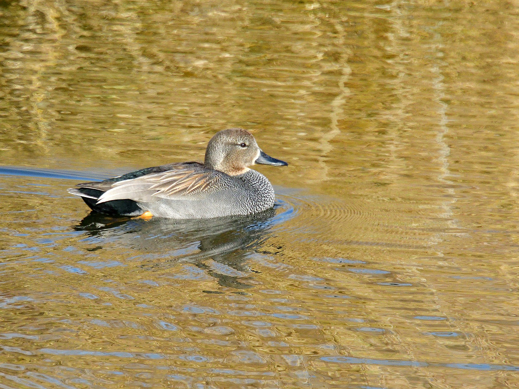 オス メスともに地味な色 次列風切の白い部は水面に浮いているときも見える。オスは尻の黒が目立ち、メスはマガモに似たくちばしで橙色をしている