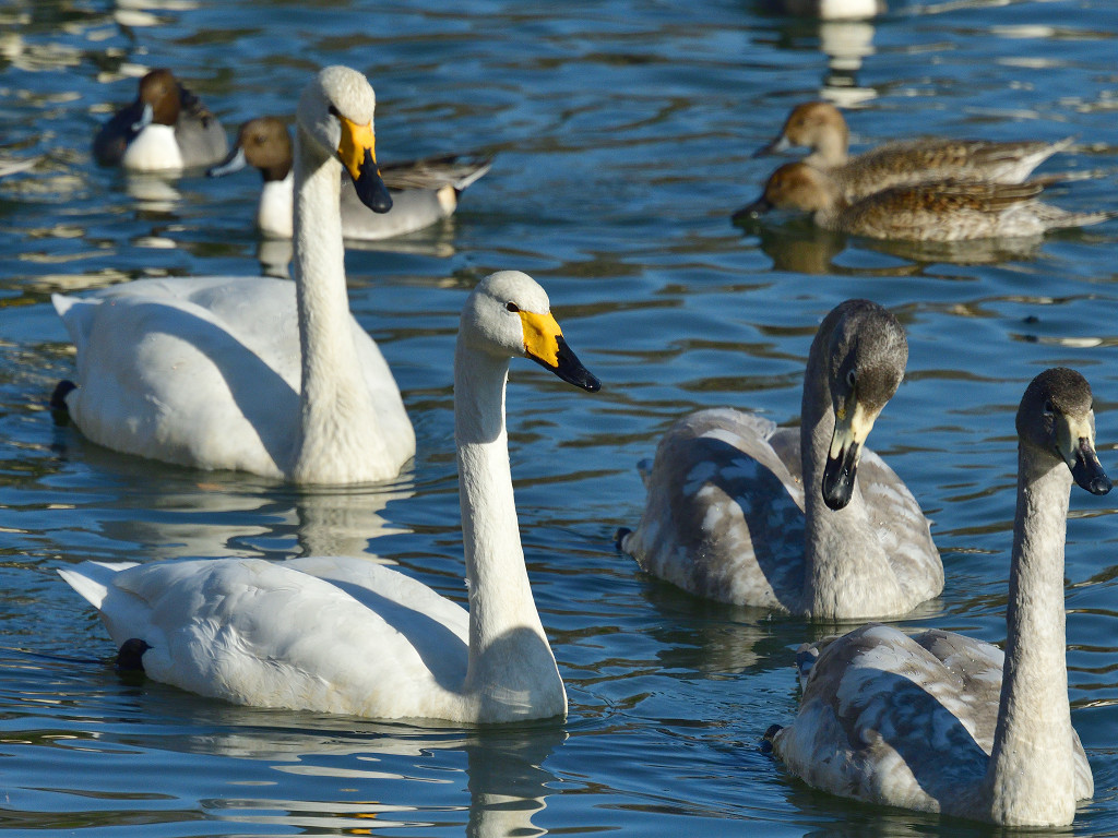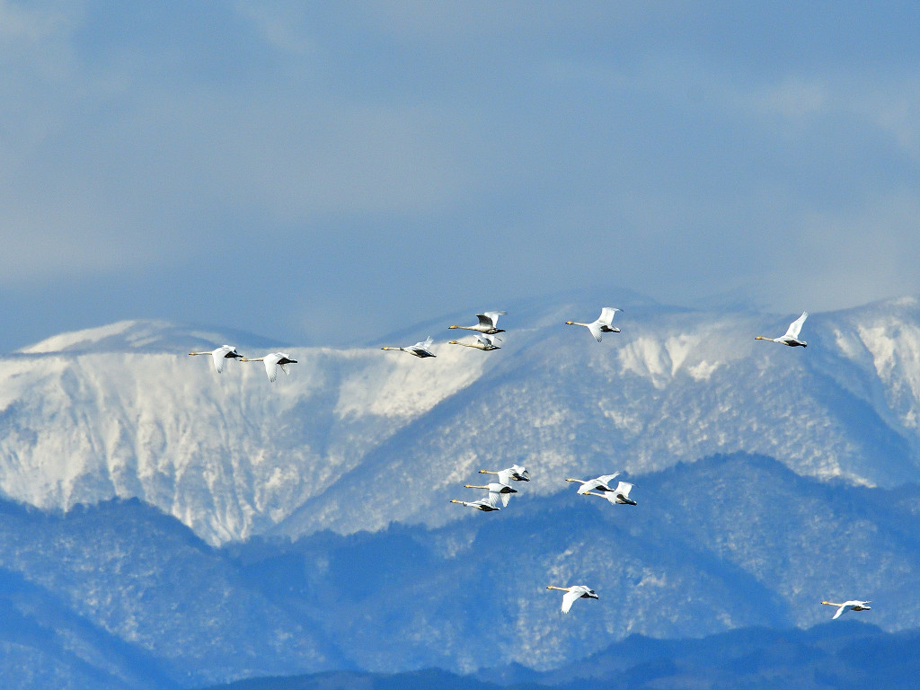 長い首を伸ばして飛ぶ 日本には冬鳥として渡来する
