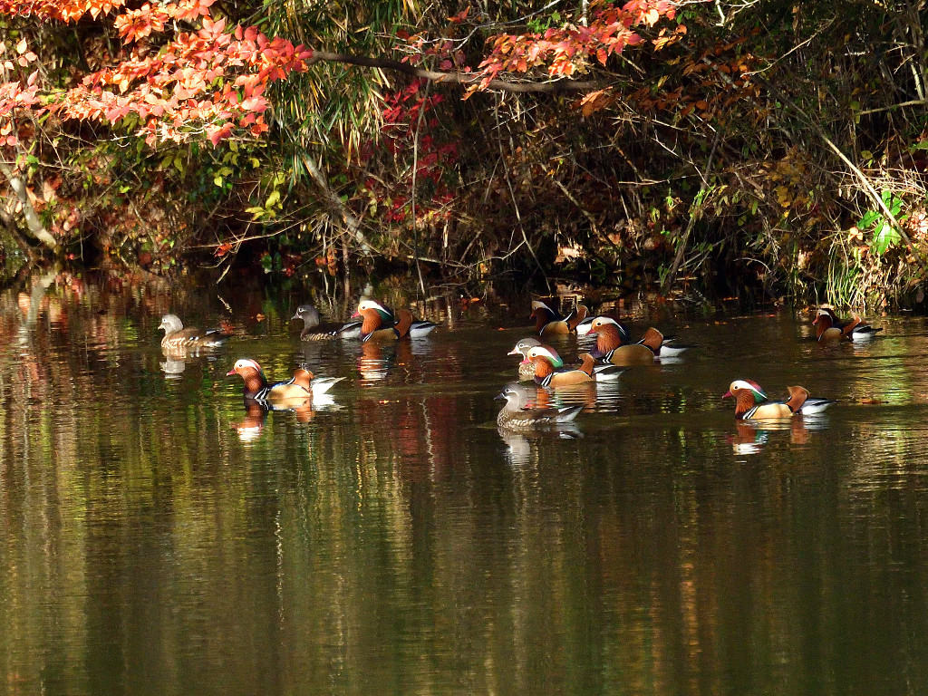 オスは橙色の大きなイチョウ羽をもち独特の色彩を持つ鳥 メスは目の周囲から後ろえ伸びた白い筋が目立つ