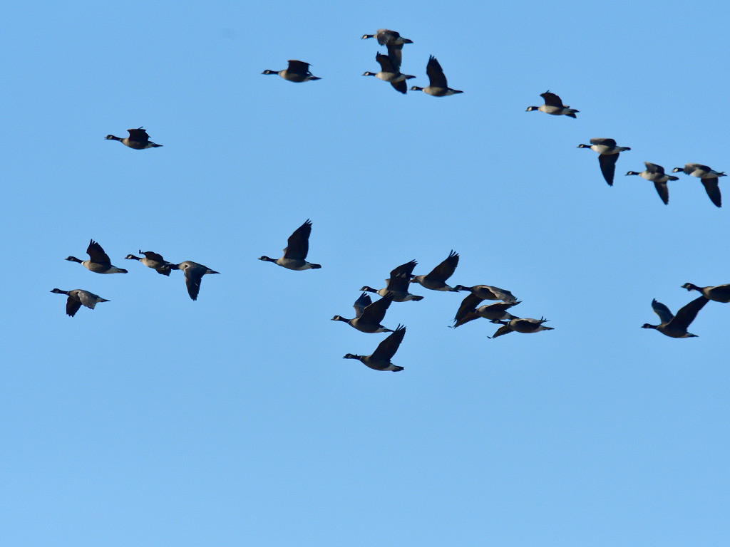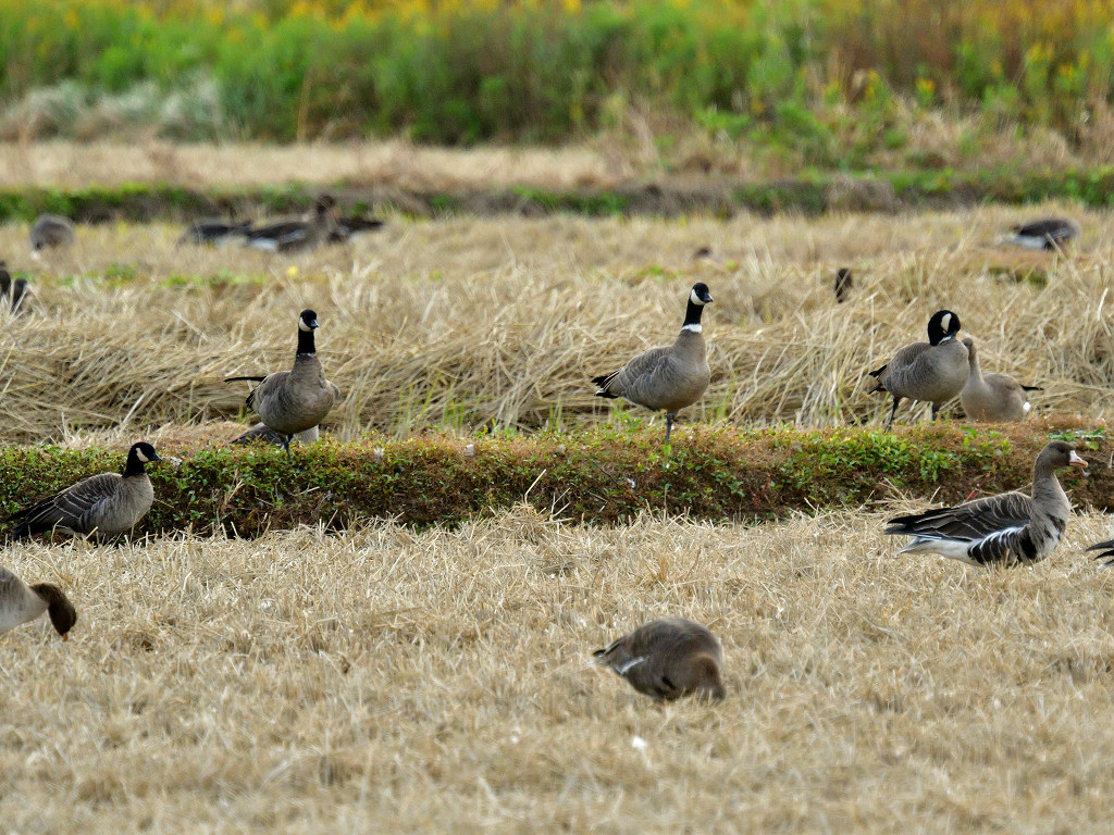 頬からのどに目立つ白い斑のある黒っぽいガン 日本には冬鳥として渡来する マガンの群れなどと行動を共にしている事がある