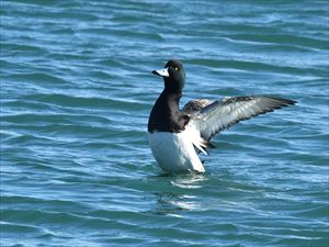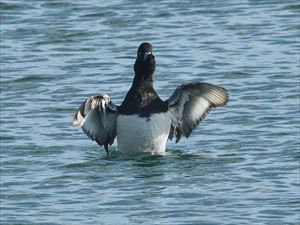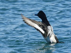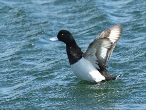 | スズガモ (鈴鴨) | ガンカモ科 | 冬鳥 | 海面に浮かぶ背と腹の白っぽい海ガモ 日本には冬鳥とした渡来 キンクロハジロに似ている メスはくちばしの基部に幅に広い白色部がある (仲間) コスズガモ |