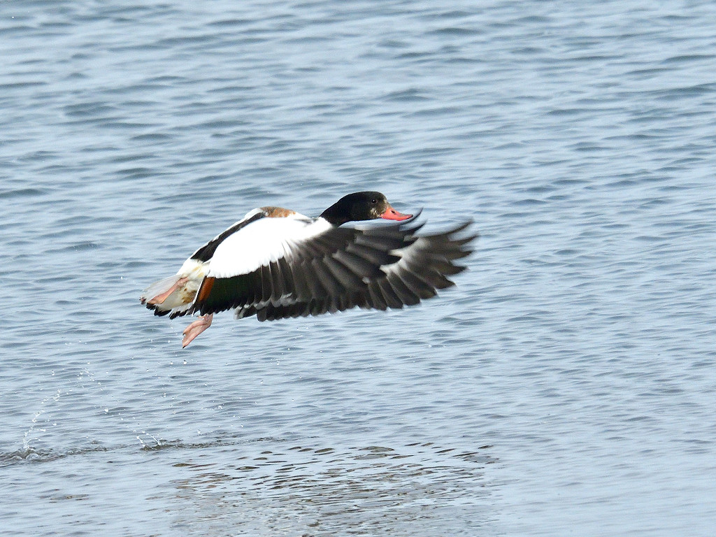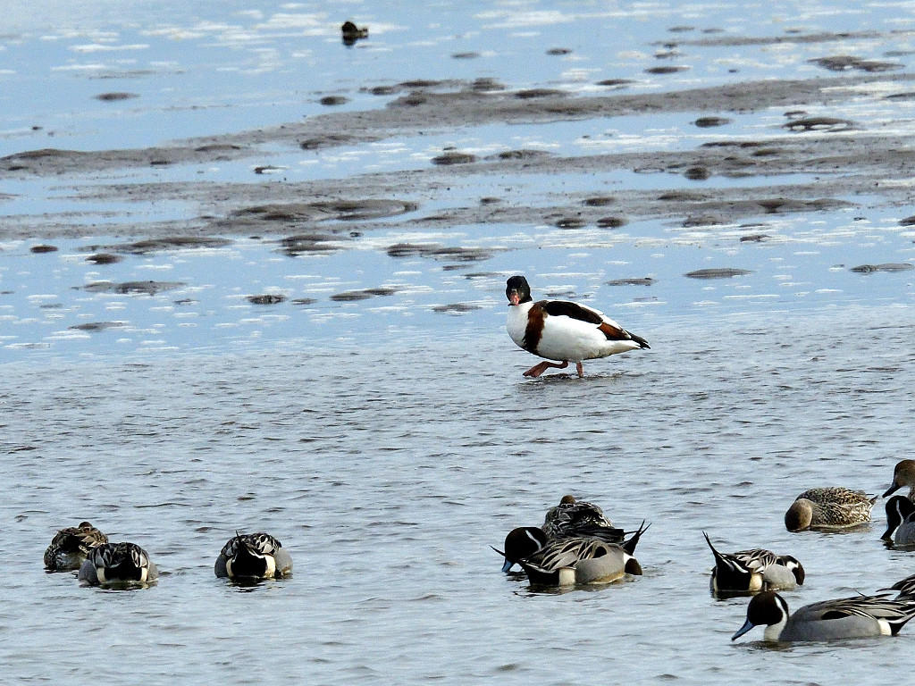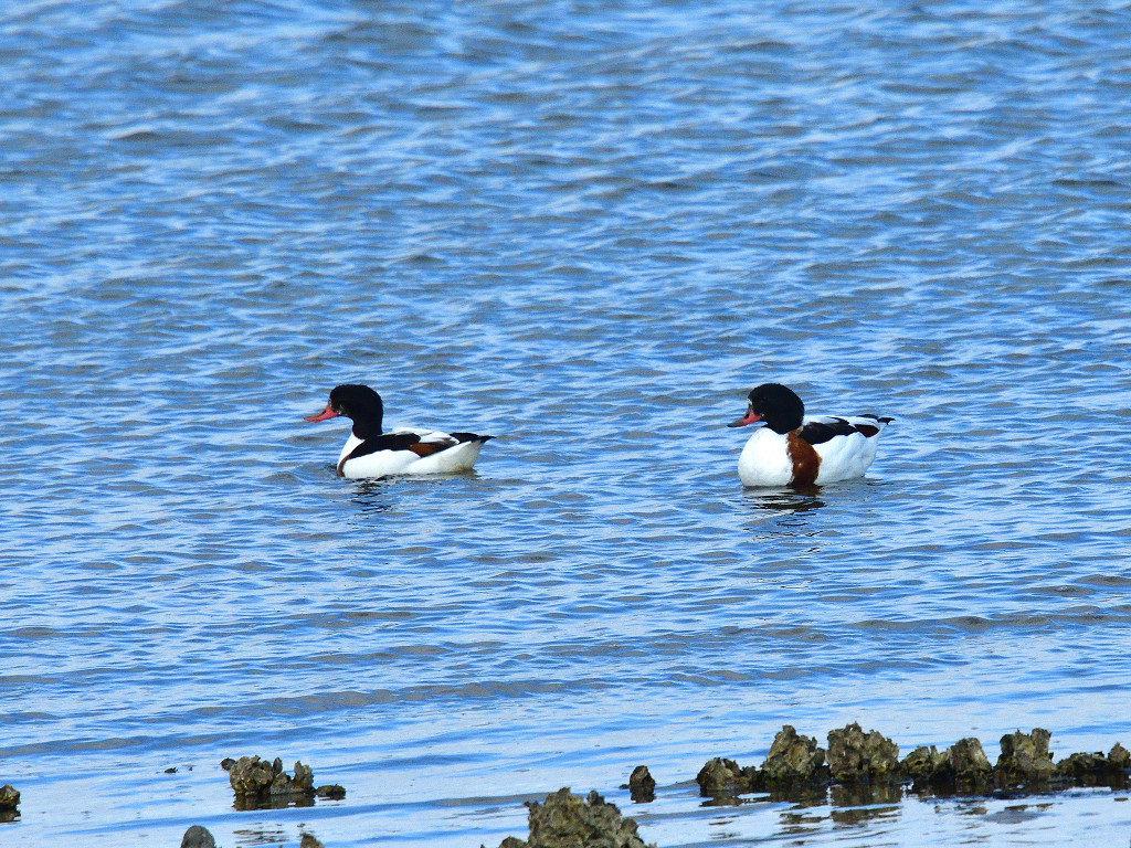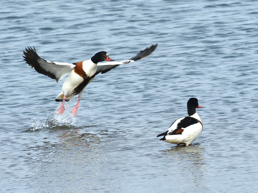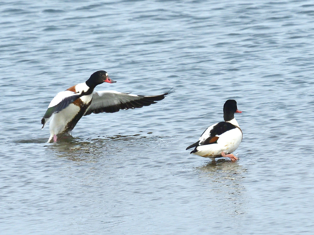 オスとメスの羽の色は同じ オスには額に嘴とつながったコブがある 体は白黒に茶色の胸帯があり、足はピンク色、嘴は赤い
