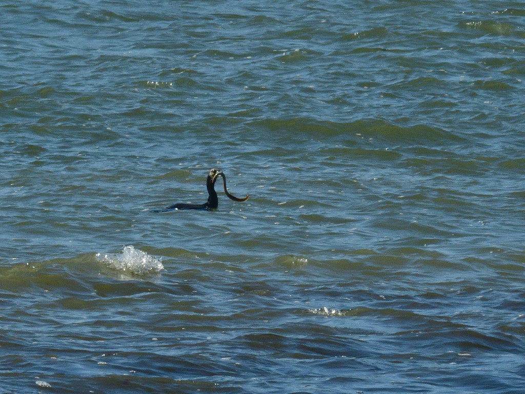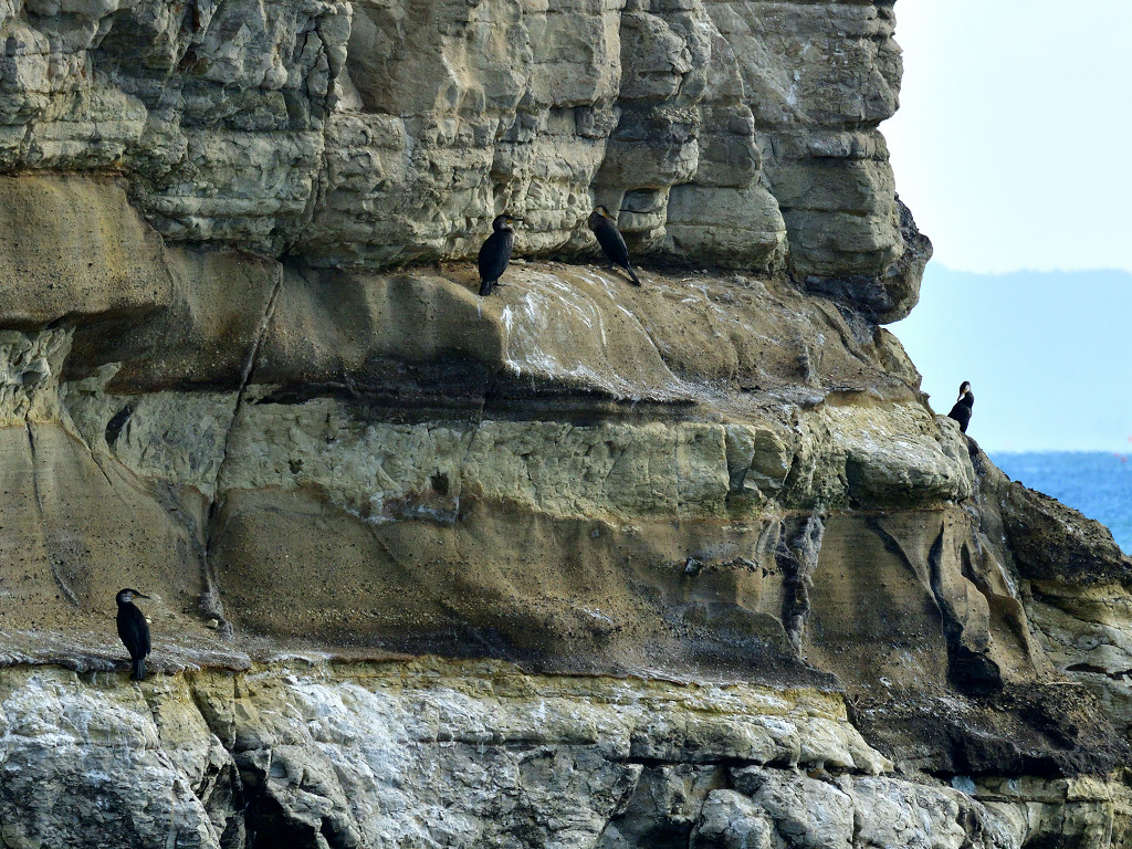 に似ているが、岩のある外海に多い ウミウは、くちばしの付け根の黄色い部分が、目の後方にとがっている(カワウは尖らない)