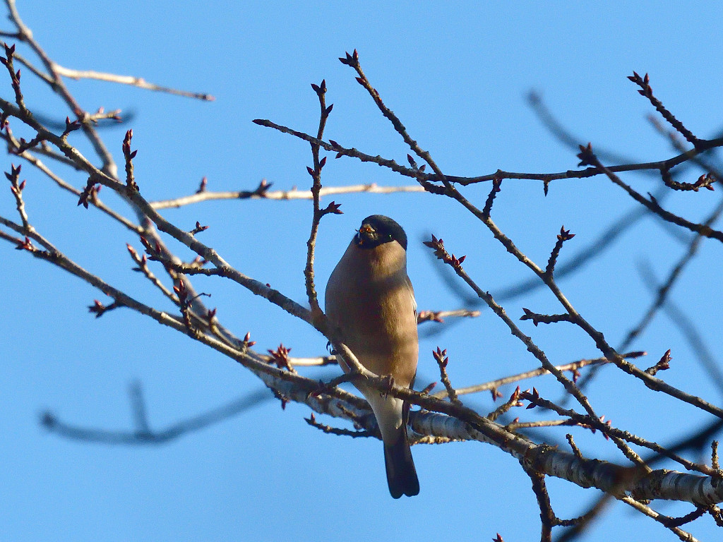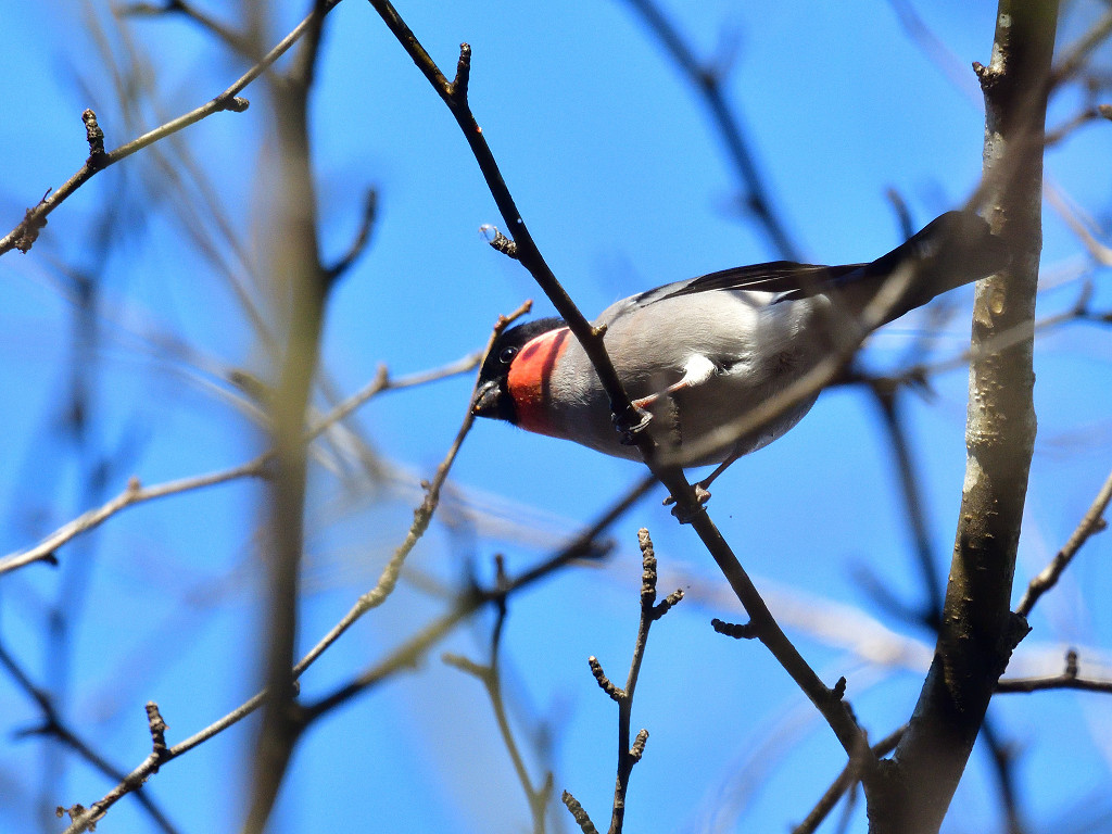 頬が紅色 笛のような声で鳴きかわす 夏は亜高山帯で繁殖 冬期に低い山地や丘陵地に移動する 黒い頭、灰色の太い翼帯、白い腰が特徴 オスは頬が紅色です